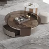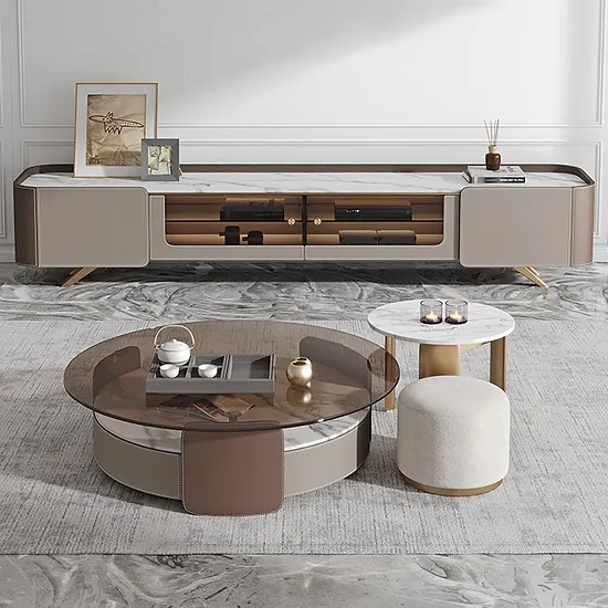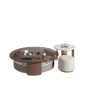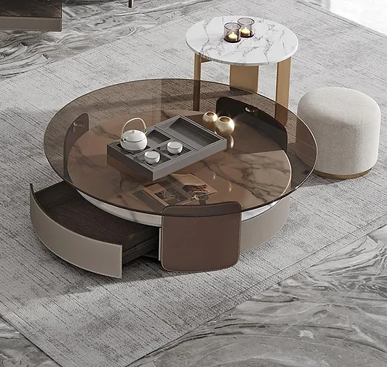 Crafted with a blend of sintered stone and tempered glass, these tables offer durability and elegance. The tempered glass top provides a smooth surface for everyday use, while the sintered stone base adds a sleek and sturdy foundation. The three-piece set can be arranged to suit your space and needs, offering versatility and function.