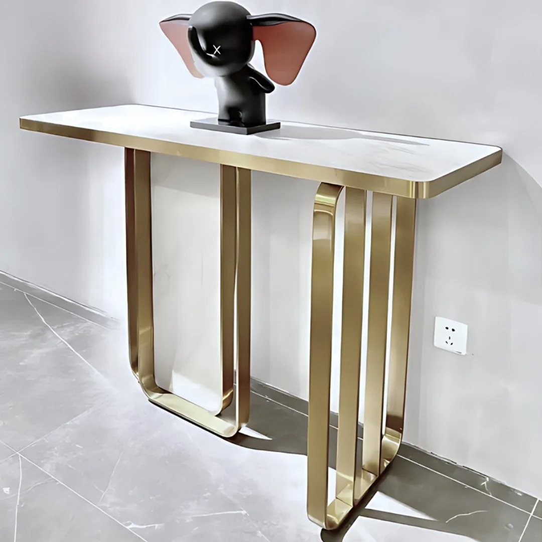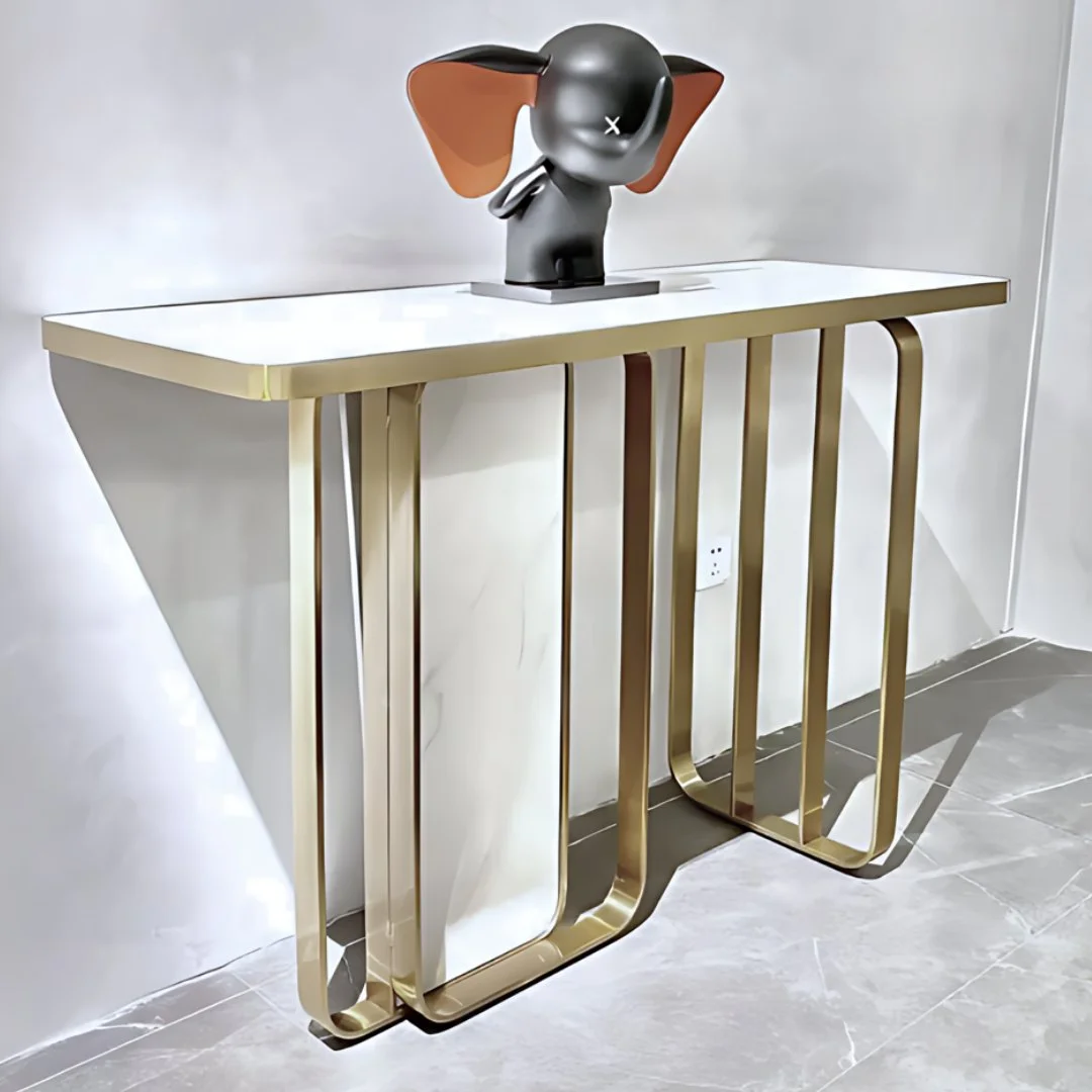 Enhance your entryway or living space with this sophisticated white and gold console table. Measuring 140 x 40 x 80 cm, it’s crafted from premium sintered stone and sleek stainless steel for durability and style. Its modern aesthetic effortlessly fits into various interiors, perfect for adding an elegant touch to any living room, hallway, or dining area.