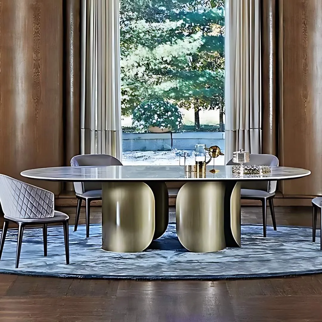 The Essence Dining Tables, measuring 2200 x 1000 x 75 cm, is a perfect blend of luxury and functionality. With a stunning white sintered stone top and a gold stainless steel base, this table adds sophistication to any dining space. Its refined design makes it ideal for formal dining rooms, meal settings, breakfast areas, or as the centerpiece of open-plan living spaces. Whether hosting a dinner party or enjoying family meals, the Essence Dining Table is sure to elevate your dining experience.