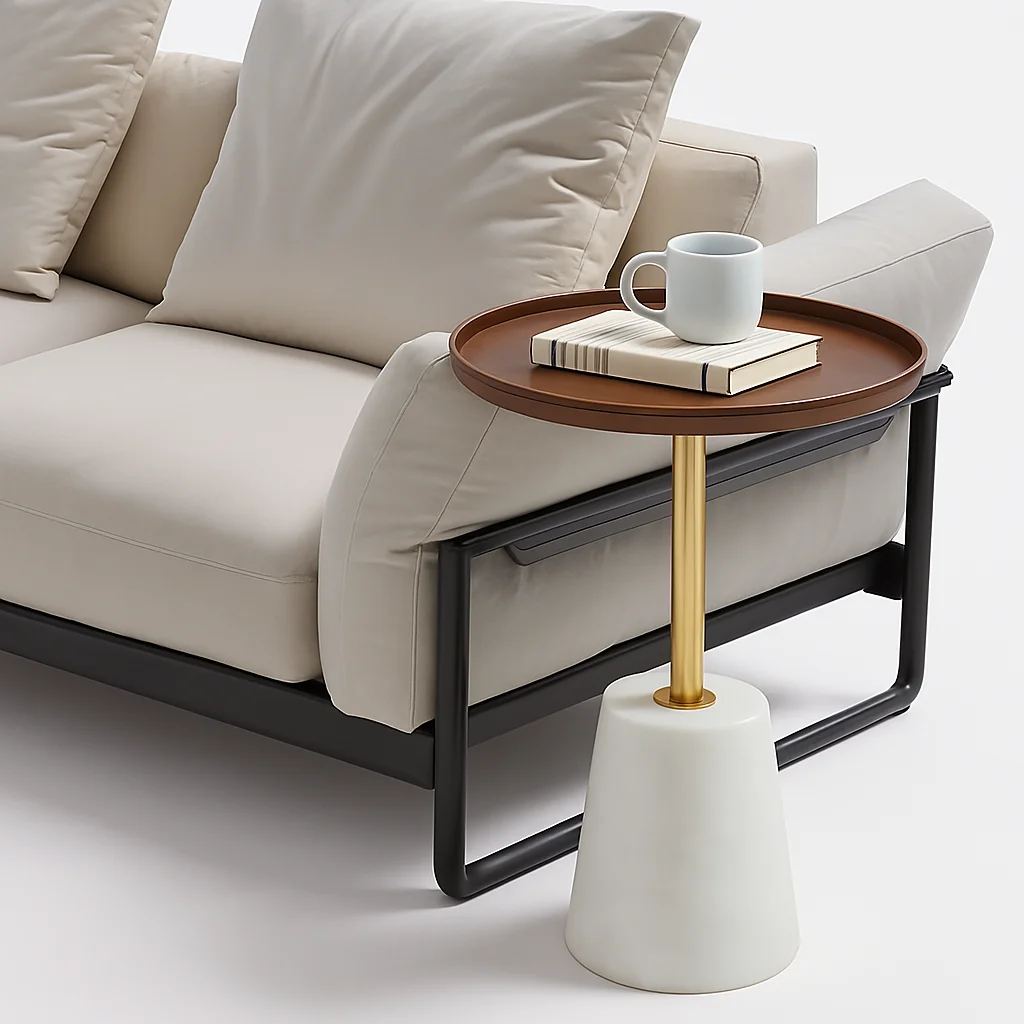 Initially, this impressive modern walnut side table gold presents a compact presence. It measures Dia 40 cm x H54 cm. This ensures a prominent yet space-efficient addition to your home. Furthermore, the durable solid wood top and natural marble base guarantee lasting beauty and a timeless appeal. Crucially, the elegant gold metal pole adds a touch of sophistication and unique visual interest. Thus, this marble base side table is perfect for holding drinks, books, or decorative items. Therefore, the Loony is a standout solid wood gold table. Ultimately, it adds a touch of captivating style and functional elegance to any setting.
