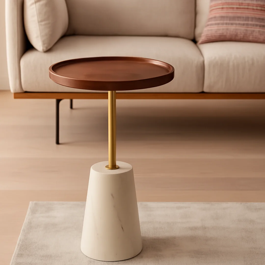 - Material: Solid Wood Top + Gold Metal Pole + Natural White Marble Base