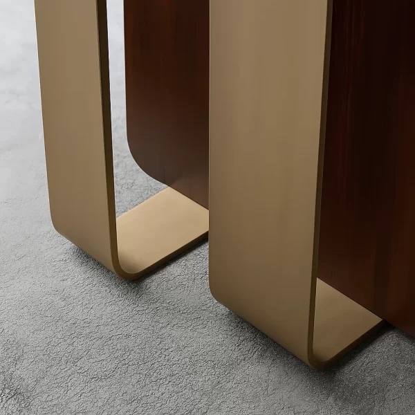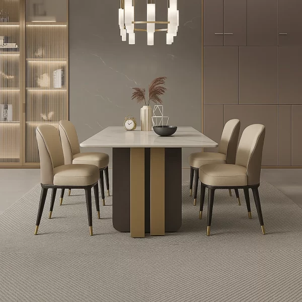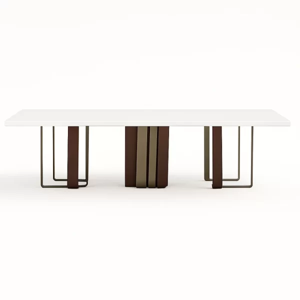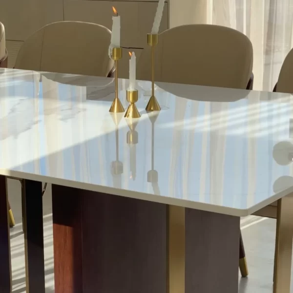 The Norami Luxury Dining Table offers a truly exquisite blend of contemporary design and unparalleled grandeur. Indeed, this sophisticated centerpiece dramatically enhances any large, modern dining area. Its expansive top, meanwhile, is crafted from genuine sintered stone, boasting a pristine white finish and unique natural veining. This beautifully complements its sturdy veneered wood frame in a rich walnut tone. Elegant stainless steel accents with gold detailing complete the design. Consequently, this luxury dining table acts as a magnificent statement piece. Moreover, it seamlessly merges refined aesthetics with exceptional durability and captivating aesthetics.