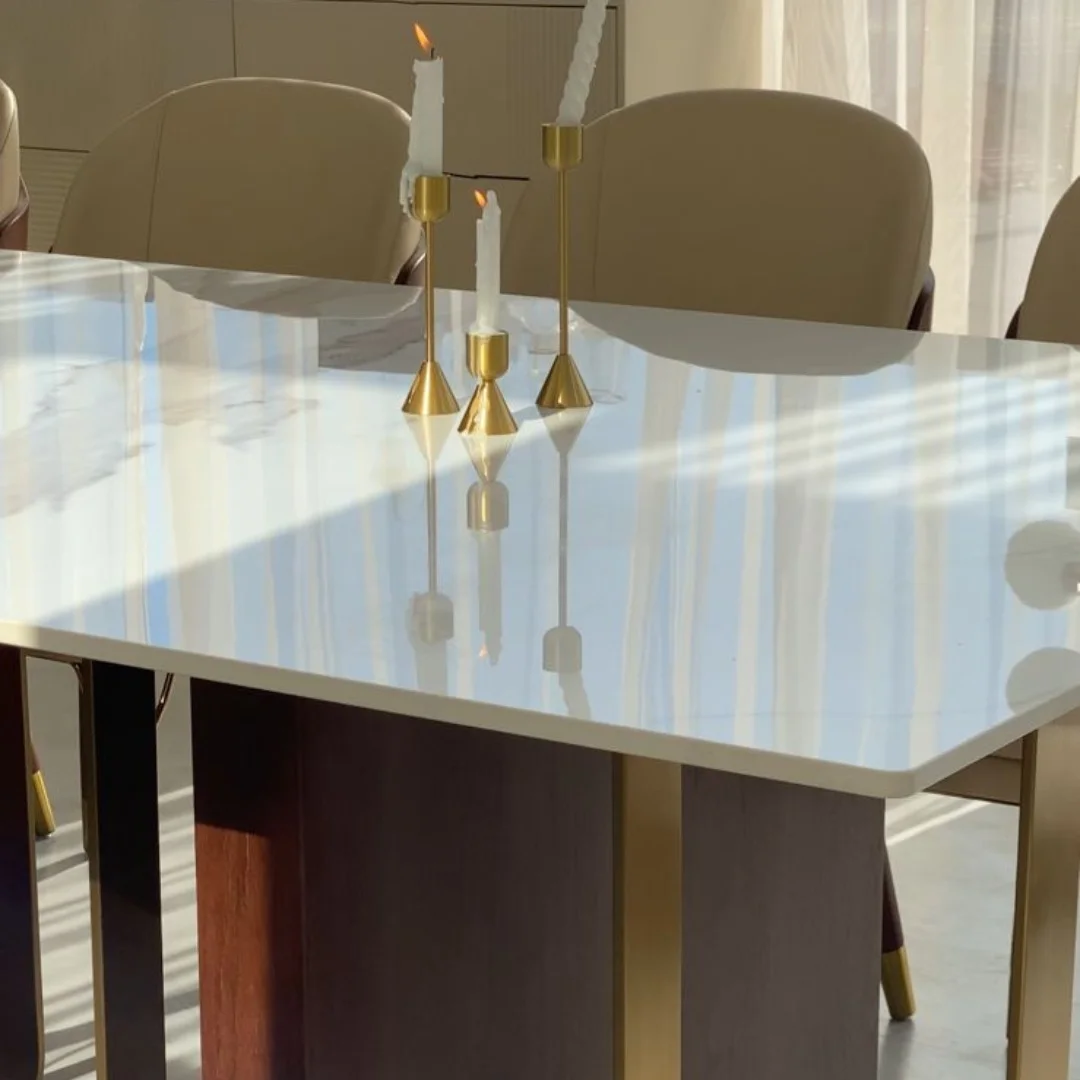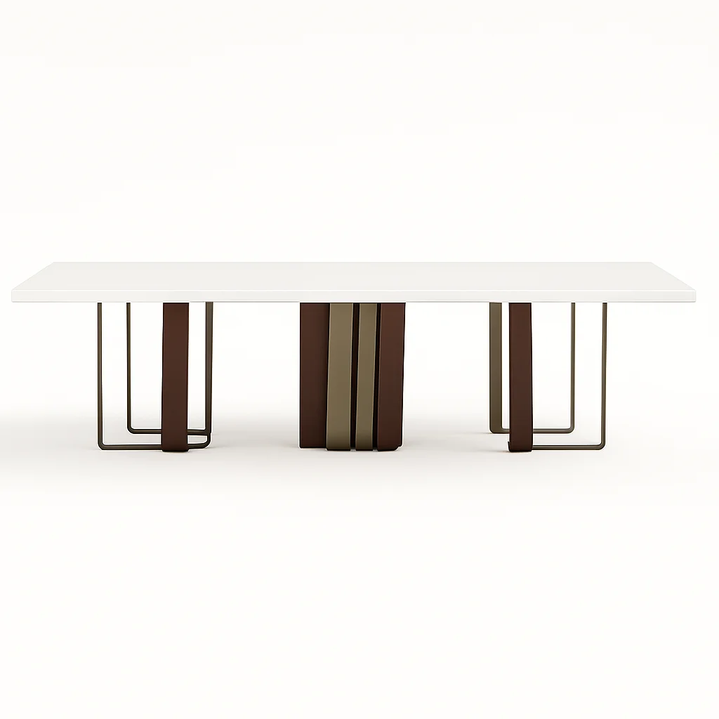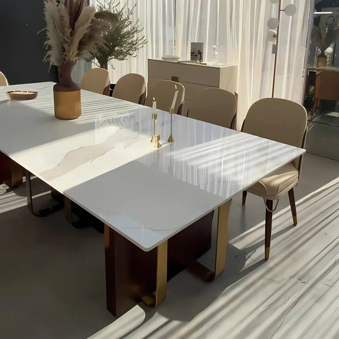 The Norami Luxury Dining Table offers a truly exquisite blend of contemporary design and unparalleled grandeur. Indeed, this sophisticated centerpiece dramatically enhances any large, modern dining area. Its expansive top, meanwhile, is crafted from genuine sintered stone, boasting a pristine white finish and unique natural veining. This beautifully complements its sturdy veneered wood frame in a rich walnut tone. Elegant stainless steel accents with gold detailing complete the design. Consequently, this luxury dining table acts as a magnificent statement piece. Moreover, it seamlessly merges refined aesthetics with exceptional durability and captivating aesthetics.