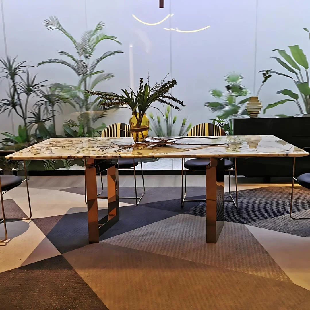 The Ocean Sintered Stone Dining Table offers a truly exquisite blend of modern elegance and robust luxury. Indeed, this sophisticated piece dramatically enhances any contemporary dining area. Its expansive top, meanwhile, is crafted from genuine sintered stone, boasting a pristine white finish and unique natural veining. This beautifully complements its sturdy stainless steel base with striking gold accents. Consequently, this sintered stone dining table acts as a magnificent statement piece. Moreover, it seamlessly merges refined design with exceptional durability and captivating aesthetics.