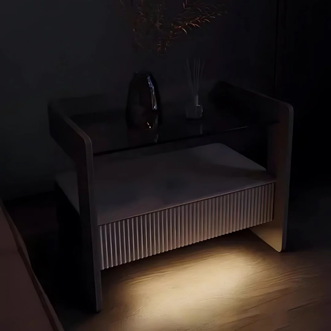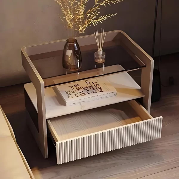 Initially, this impressive modern beige nightstand presents a compact presence. It measures L55 cm x W37 cm x H48 cm. This ensures a prominent yet space-efficient addition to your sleep sanctuary. Furthermore, the high-quality tempered glass guarantees lasting durability and a modern look. Crucially, the sturdy veneered wood frame provides long-lasting stability, while faux leather accents add a touch of sophistication. Thus, this beige glass nightstand is perfect for holding bedside essentials, a lamp, or decorative items. Therefore, the Sancia is a standout veneered wood nightstand beige. Ultimately, it adds a touch of captivating style and functional versatility to any setting.