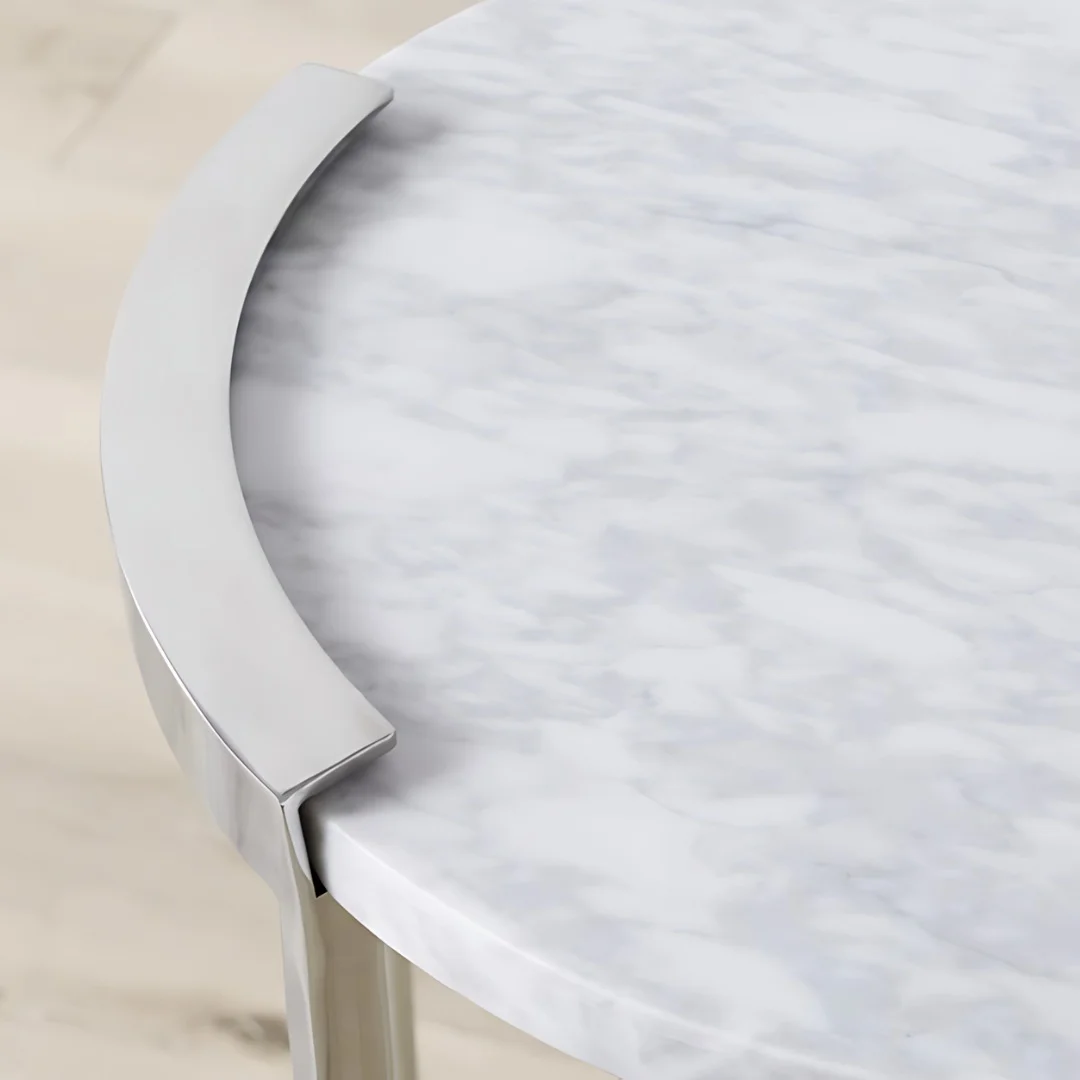 Initially, this impressive modern white side table presents a compact presence. It measures Dia 40 cm x H54 cm. This ensures a prominent yet space-efficient addition to your home. Furthermore, the smooth marble surface is inherently easy to clean and maintain. This makes it ideal for everyday use. Crucially, the elegant white marble and sleek metal blend effortlessly with various decor palettes. Thus, this round marble side table is perfect for holding drinks, books, or decorative items. Therefore, the Stowe is a standout metal base side table. Ultimately, it adds a touch of captivating style and functional elegance to any setting.