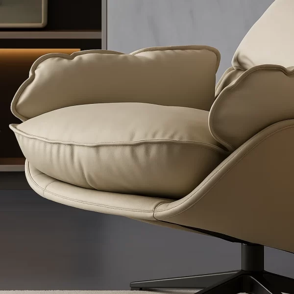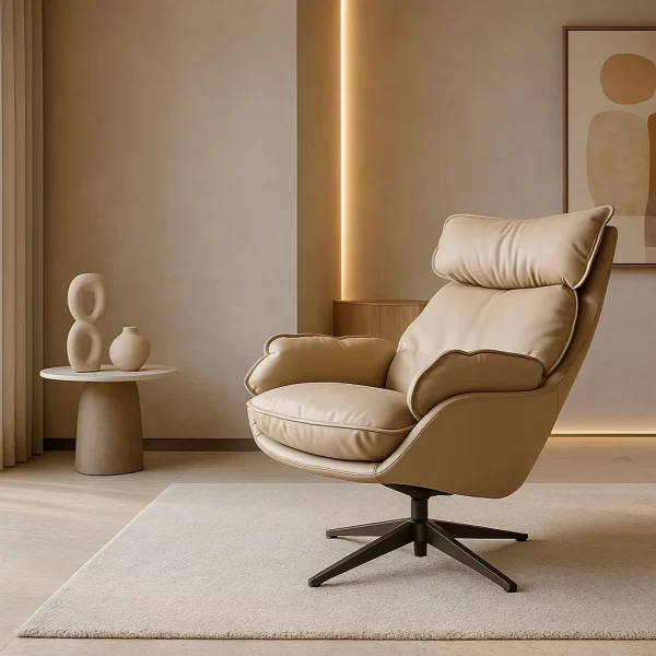 The Varaia Beige Swivel Leisure Chair offers a truly exquisite blend of modern design and luxurious comfort. Indeed, this sophisticated armchair dramatically enhances any contemporary living room, bedroom, or lounge area. Its sleek upholstery, meanwhile, is crafted from durable beige faux leather, providing an inviting texture and elegant sheen. This beautifully rests upon a sturdy steel swivel base. Consequently, this beige swivel leisure chair acts as a magnificent statement piece. Moreover, it seamlessly merges refined aesthetics with exceptional relaxation and versatile movement.
