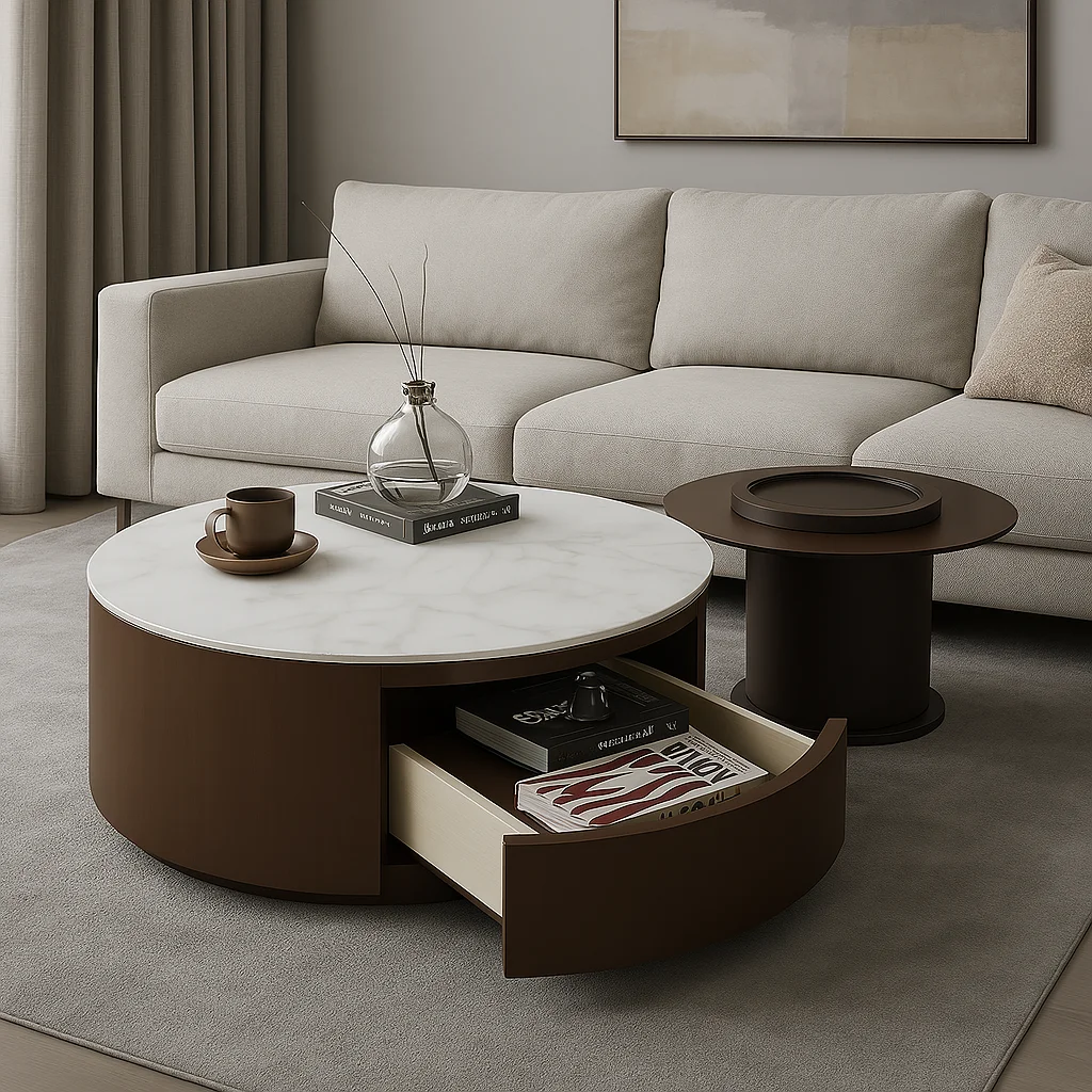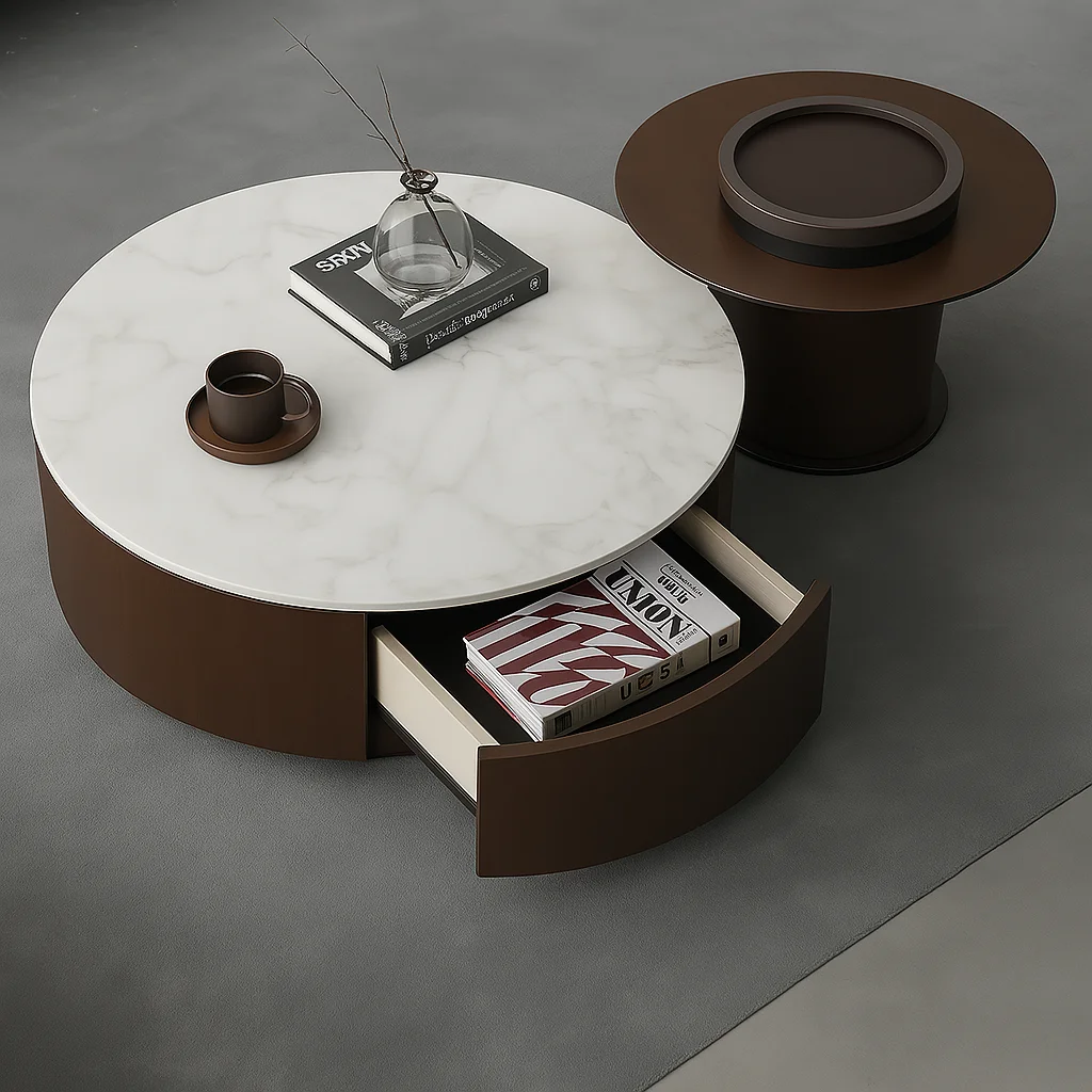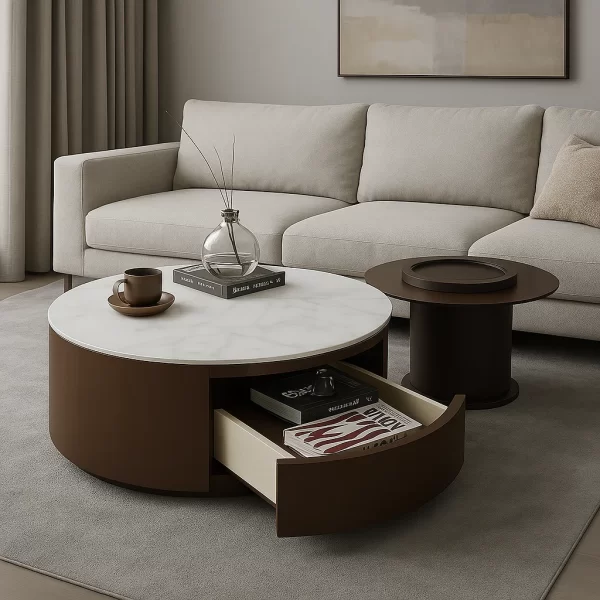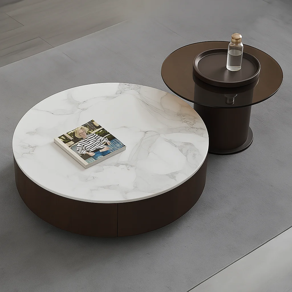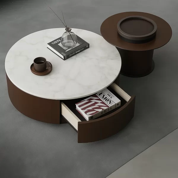 - Luxurious Sintered Stone Top: Primarily, it showcases a distinctive sintered stone glass coffee table design, with a pristine white sintered stone surface on the larger table. This, consequently, perfectly complements contemporary and minimalist aesthetics.